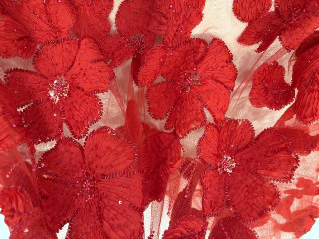 Vyšívaný tyl s květinovým motivem působí plasticky a vytváří exkluzivní vzhled, ideální pro náročné módní kreace. Vzor je koncipován tak, že ve spodní části látky je hustší a směrem vzhůru postupně řídne. Tento efekt dodává modelům lehkost, vzdušnost a zároveň zdůrazňuje siluetu Je ideální k výrobě tanečních, karnevalových či divadelních kostýmů, společenské a plesové šaty, topy, korzety. K látce můžete dokoupit také vhodný satén, šifon a nebo tyl