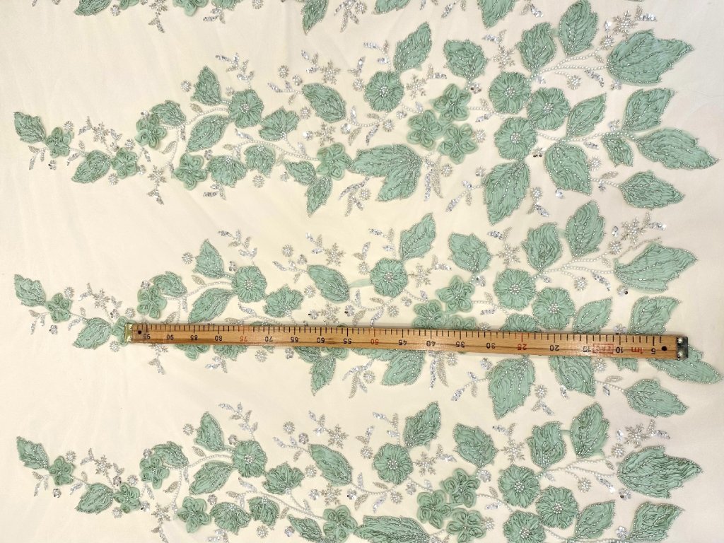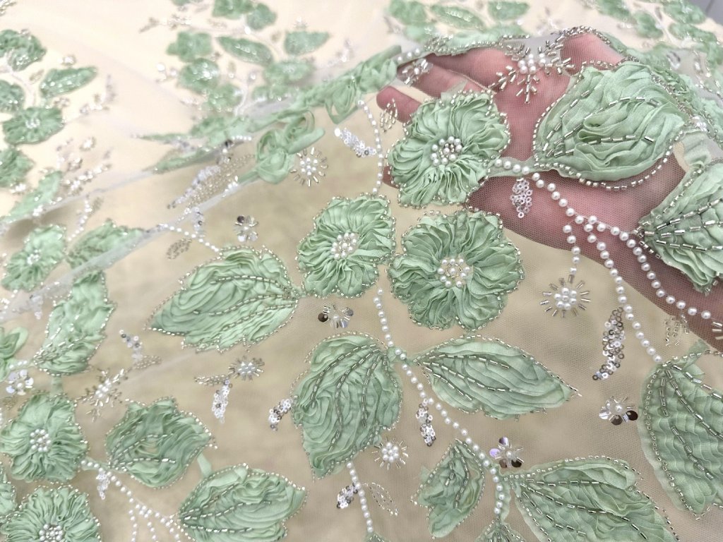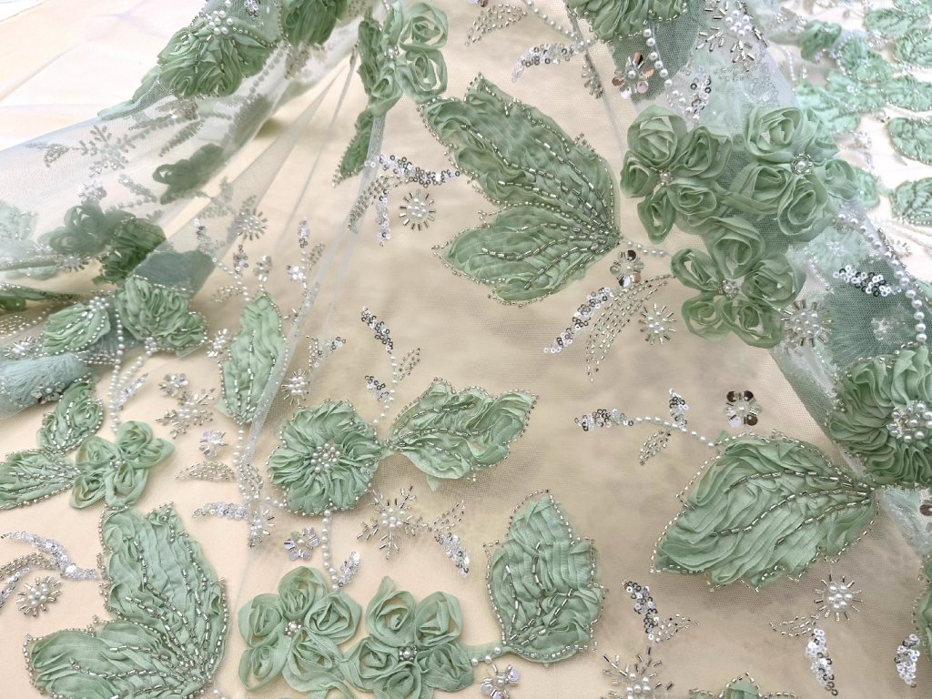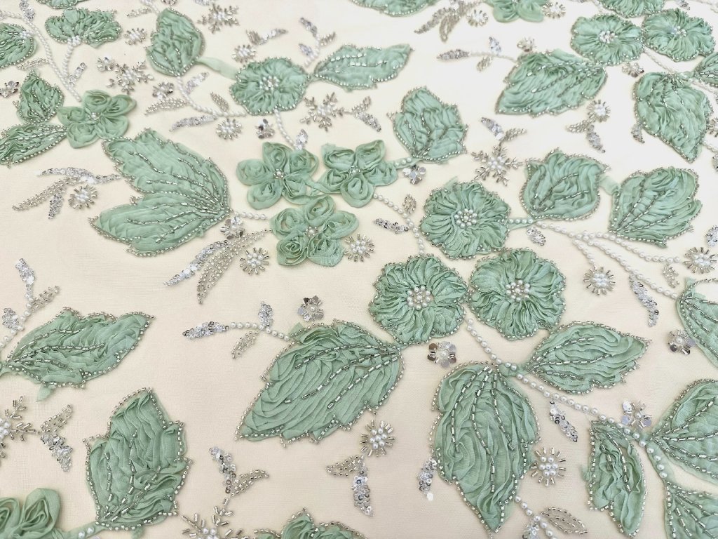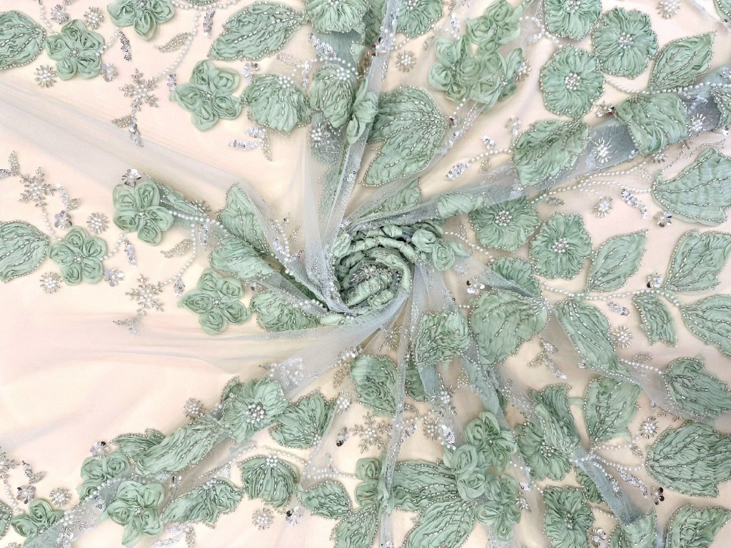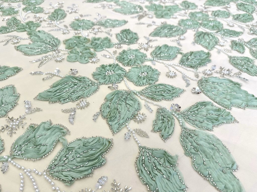 3D vyšívaná krajka – zelenkavé květy a listy s bohatým zdobením