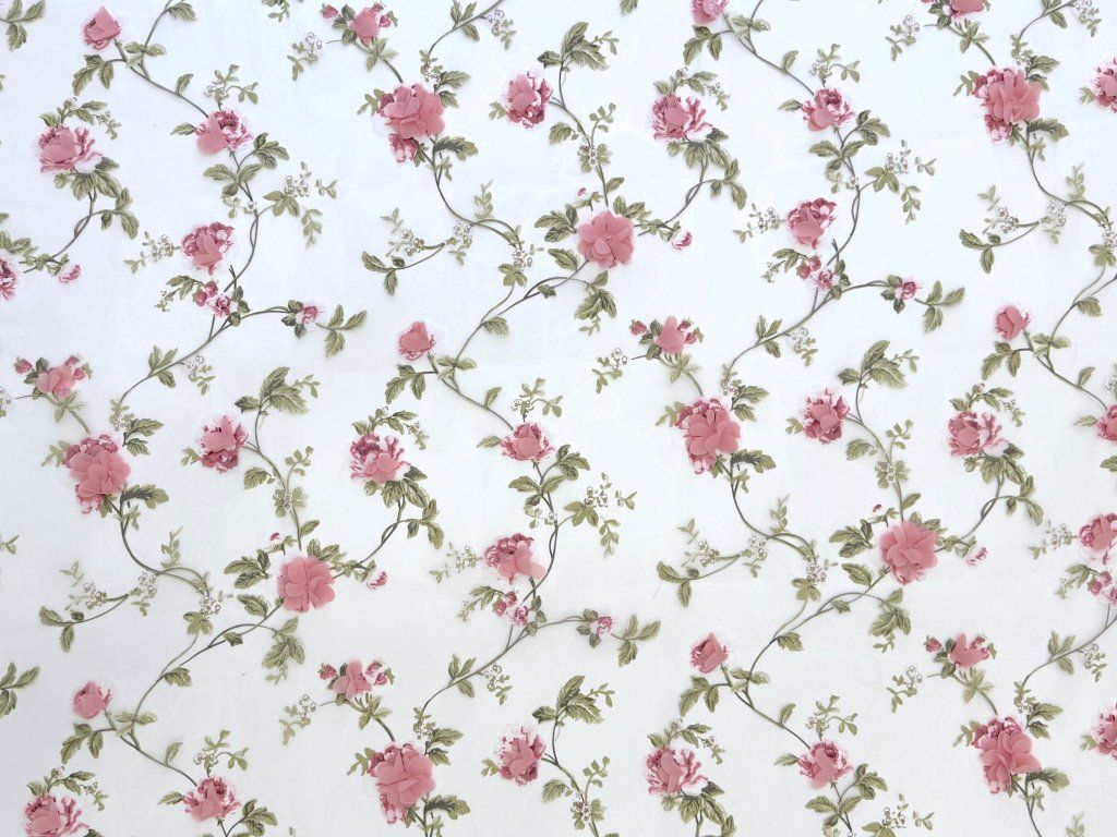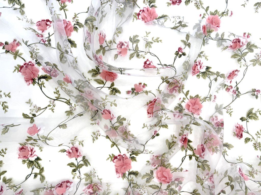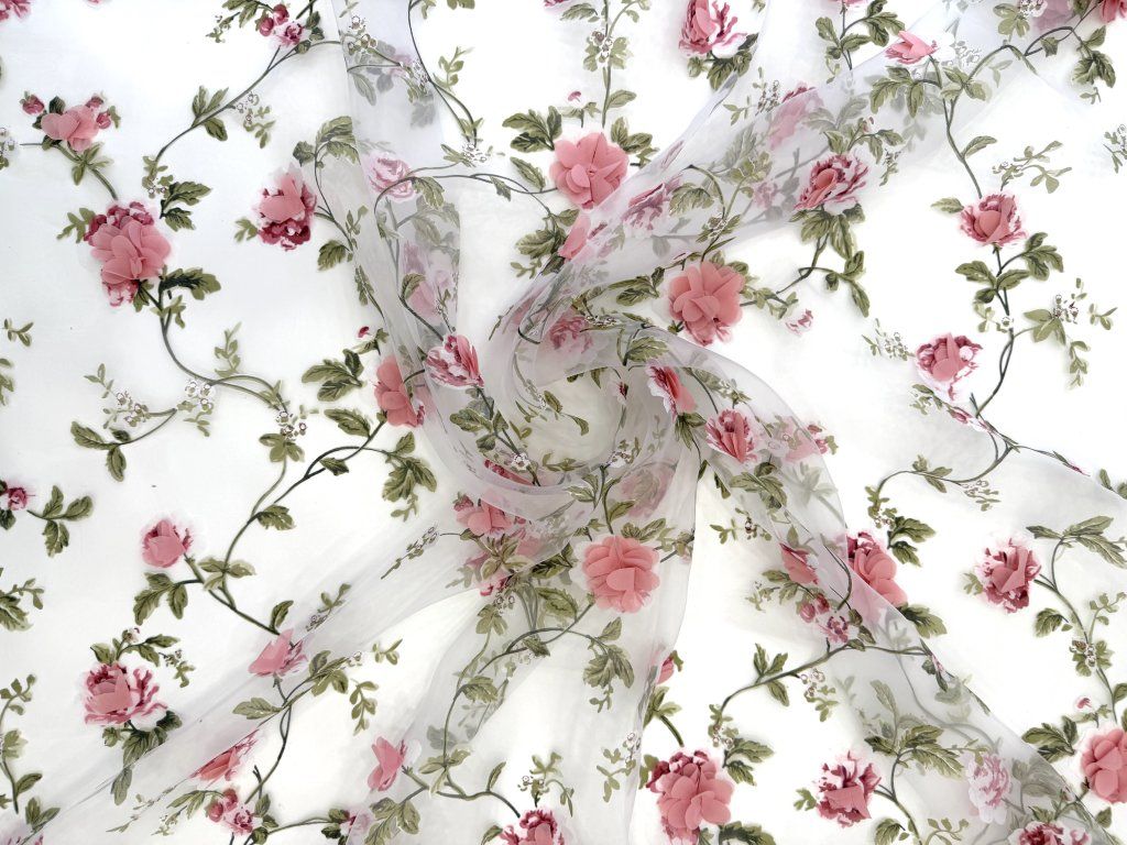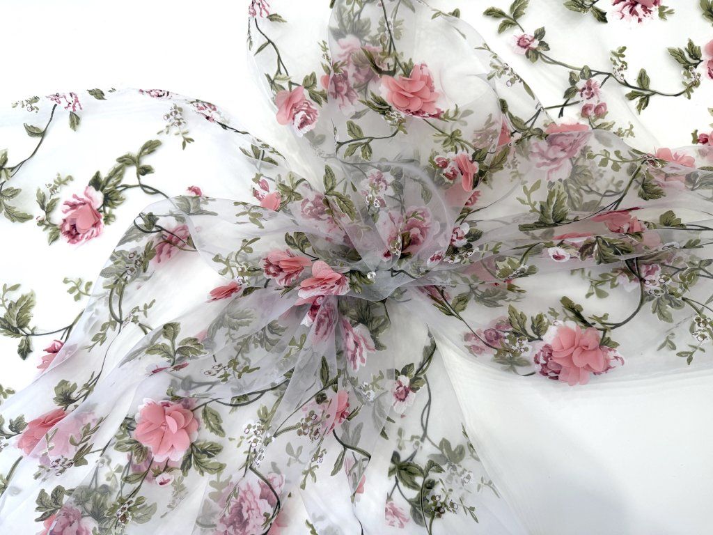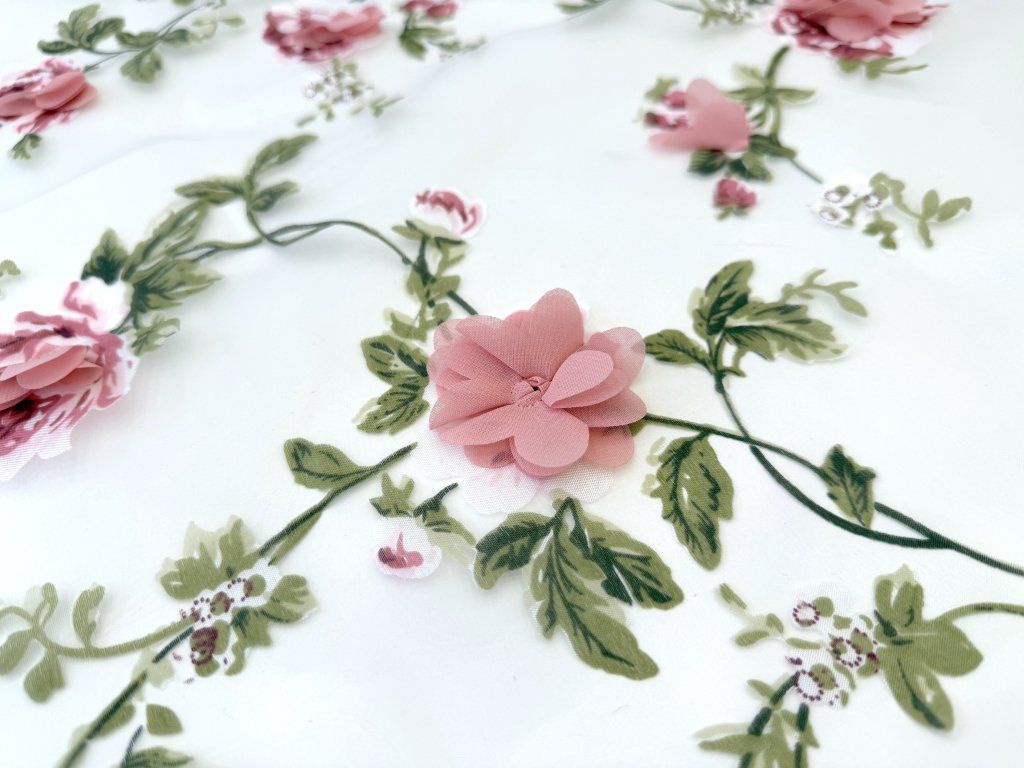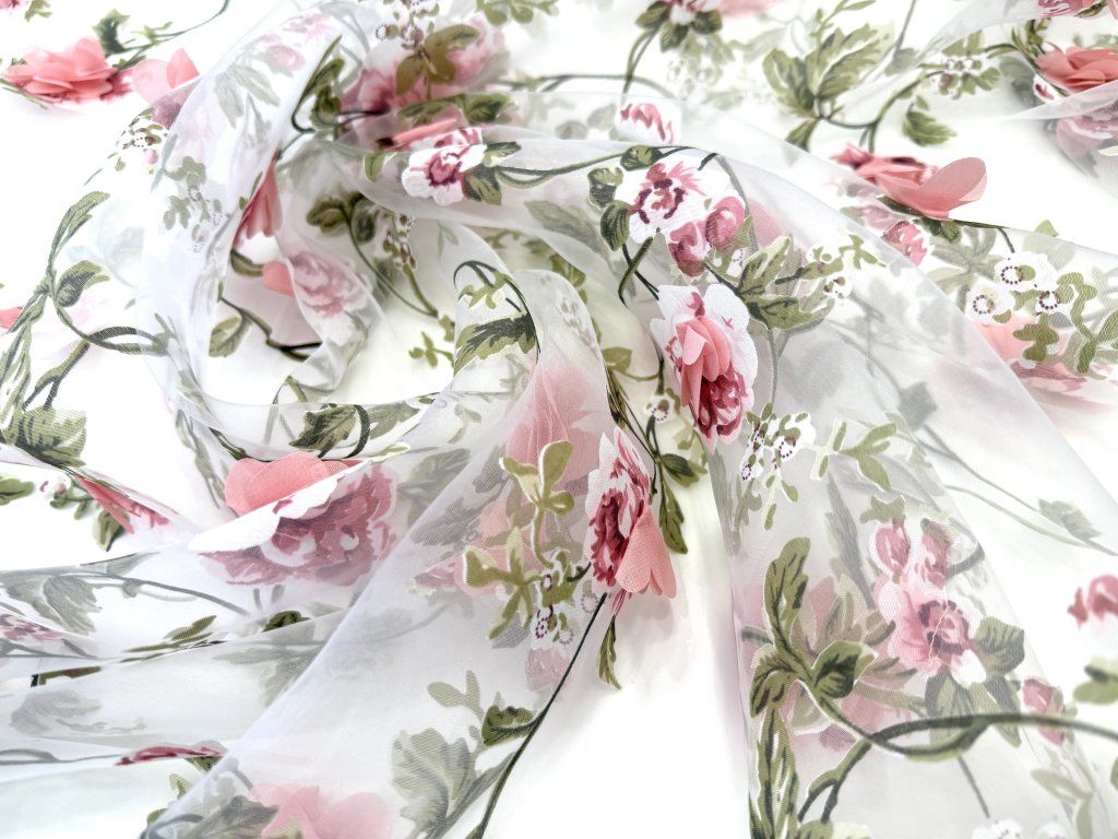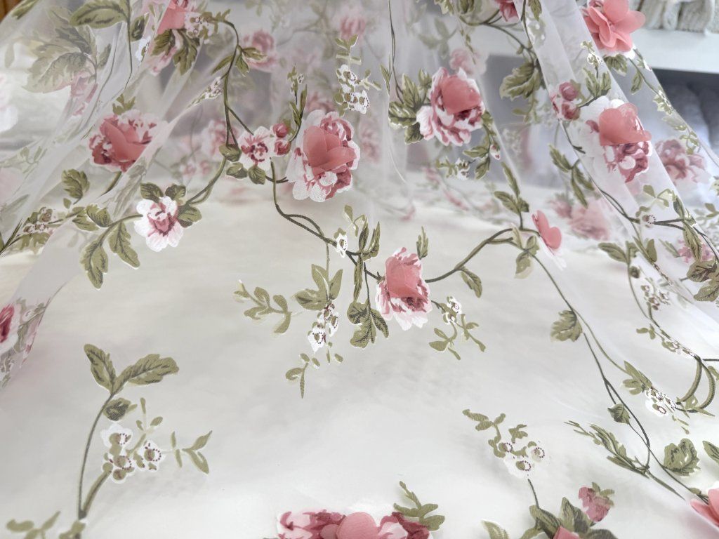 Elegantní organza s něžným květinovým motivem ve starorůžových a zelenýchv tónech je doplněna o plastické 3D květy, které dodávají látce hloubku a luxusní vzhled. Podklad je transparentní, díky čemuž látka působí vzdušně a velmi žensky.