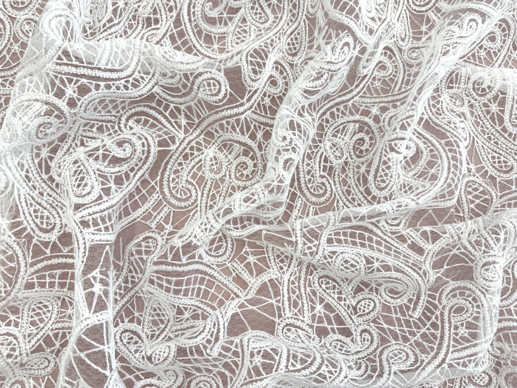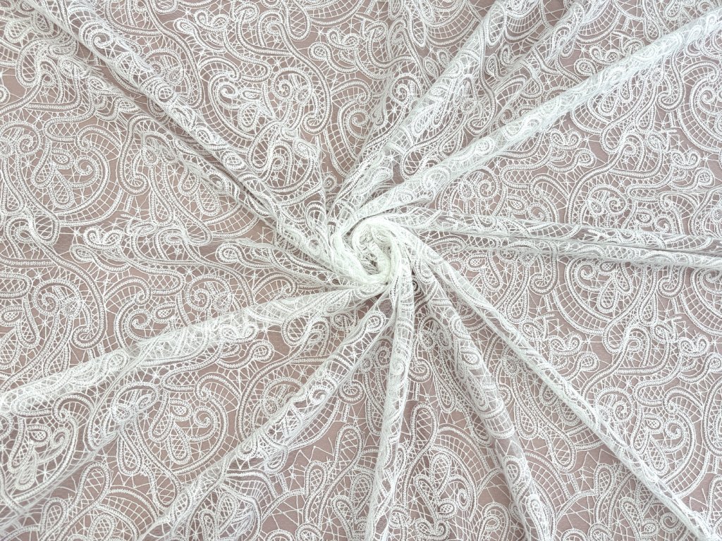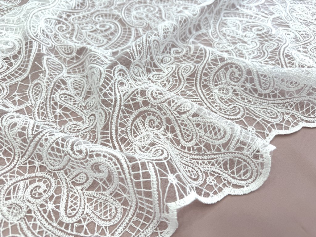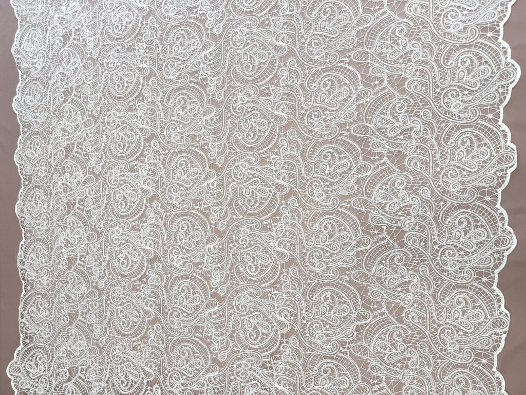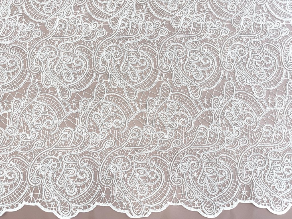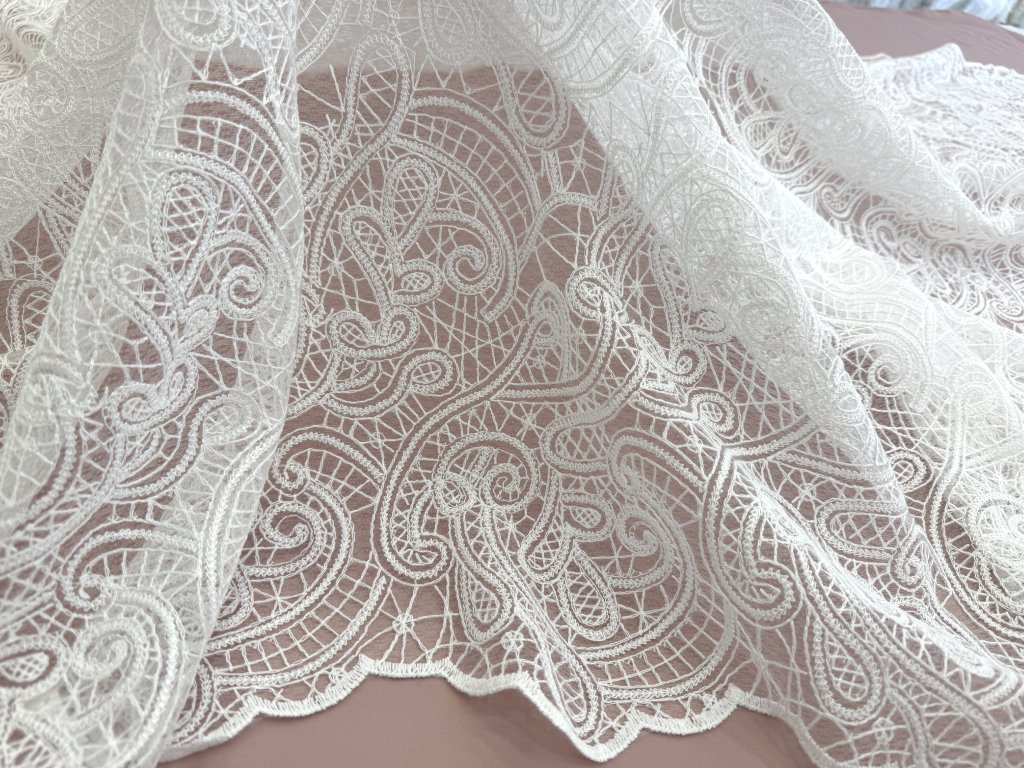 Romantická vyšívaná krajka na jemném tylu s elegantním ornamentálním paisley vzorem, která působí velmi něžně a ženským dojmem. Látka má ozdobnou vlnkovou borduru z obou stran, což je ideální pro šití svatebních šatů – zakončení lze efektně využít například na spodním okraji sukně, vlečce nebo na rukávech.