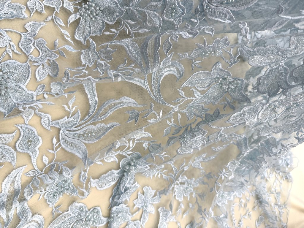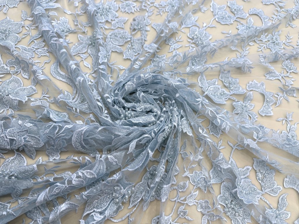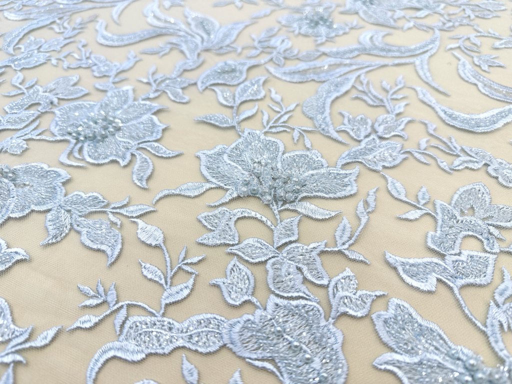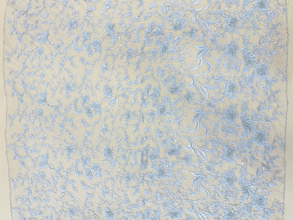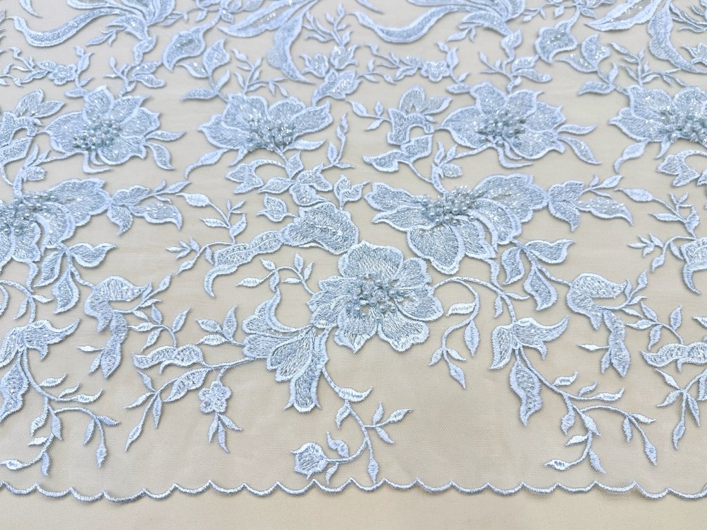 Světle modrá vyšívaná krajka – květinový vzor s lístky