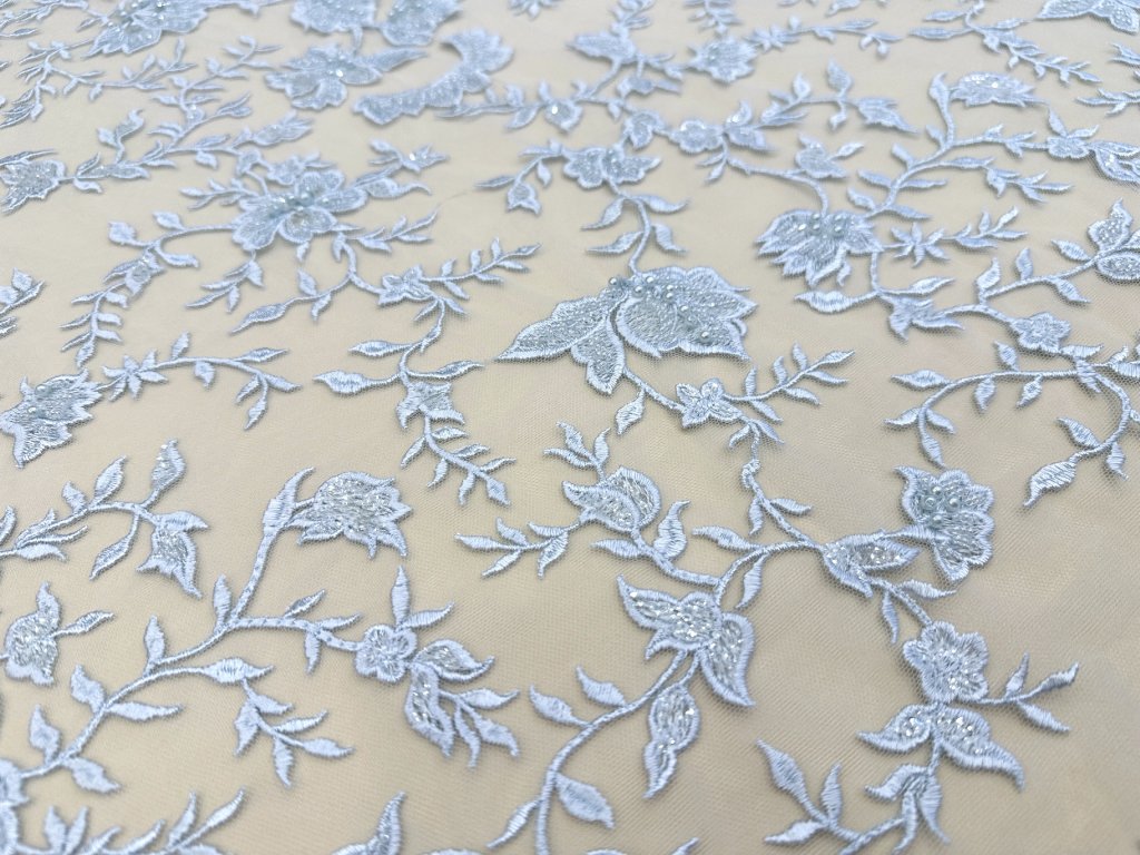 Jemný tyl je vybrán ve stejném barevném odstínu jako výšivka, takže krajka působí velmi čistě a elegantně. Obě strany látky jsou zakončeny ozdobným scallop okrajem, který umožňuje krásné zakončení modelu bez dalšího lemování. Díky své lehkosti, vzdušnosti a propracovanému zdobení je tato krajka ideální na svatební šaty, korzety, sukně i luxusní společenské modely. Z krajky může být celá svrchní vrstva šatů, ale protože se jednotlivé motivy snadno vystřihují, často se používají také jako aplikace.