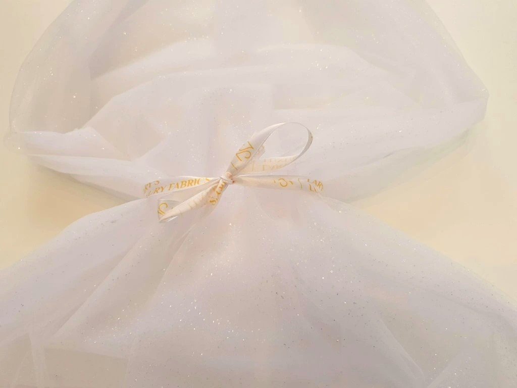 Třpytivý tyl je stejné kvality, jako tyl závojový. Jemný tyl s drobnými očky, doplněn lepenými třpytkami stříbrné barvy . Třpytivý tyl je splývavý, průsvitný a lehce pruží svou vazbou. Tyl má šíři 3 m, díky kterým vyrobíte velmi bohatý závoj nebo vlečku. Z třpytivého tylu jsou krásné bohatě nabírané princeznovské svatební šaty a tylové sukně. Tylová třpytivá látka je vhodná jako efektní aplikace na oděv, na zdobení klobouků, a aplikace do klobouků. Jemný třpytivý tyl vhodný i jako aranžmá do svatebních kytic, svatební tabule, vánoční dekorace .
