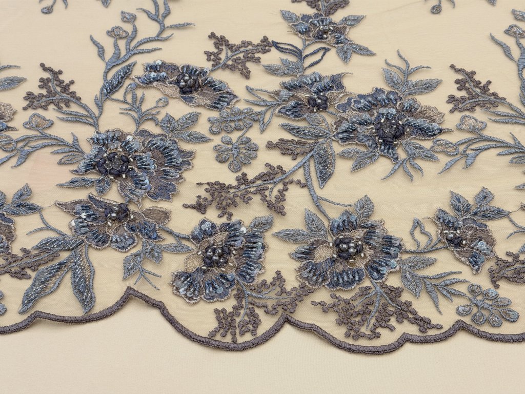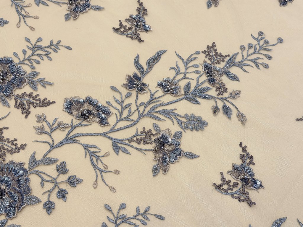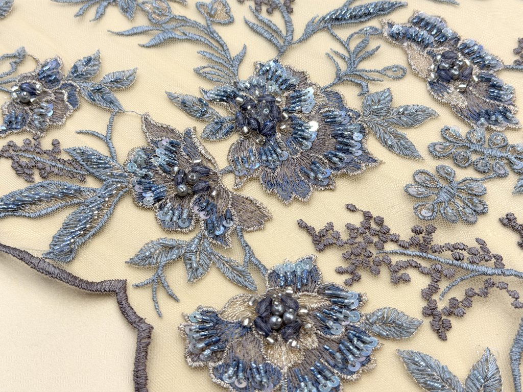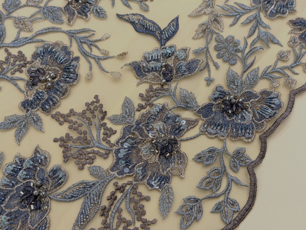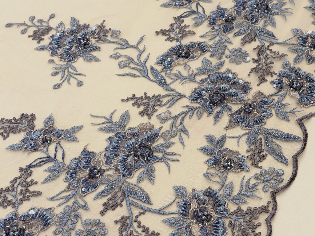 Vyšívaná krajka na jemném tylovém podkladu v odstínu cappuccino. Bohatá květinová výšivka v tónech modré, šedo-stříbrné a mocca je doplněna korálky, flitry a plastickými detaily, které vytvářejí jemný efekt hloubky a luxusního třpytu.