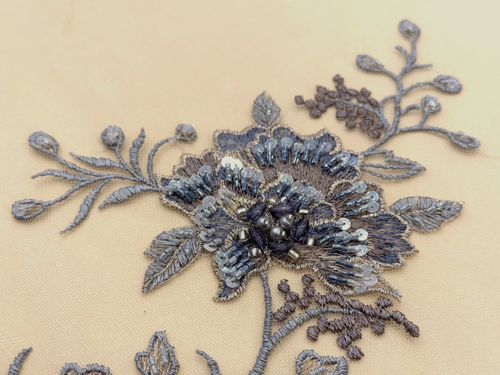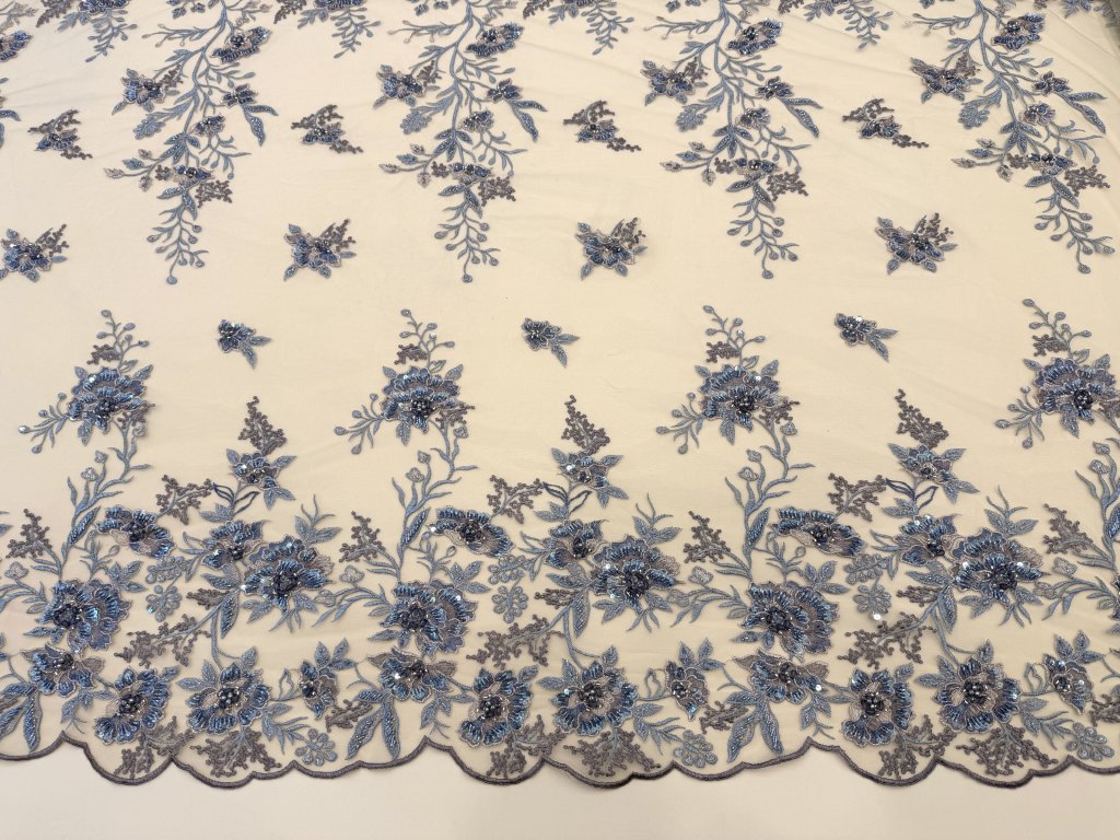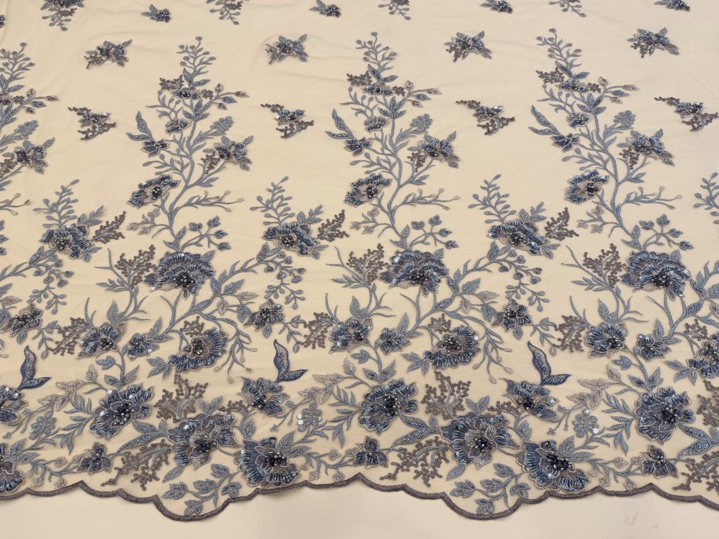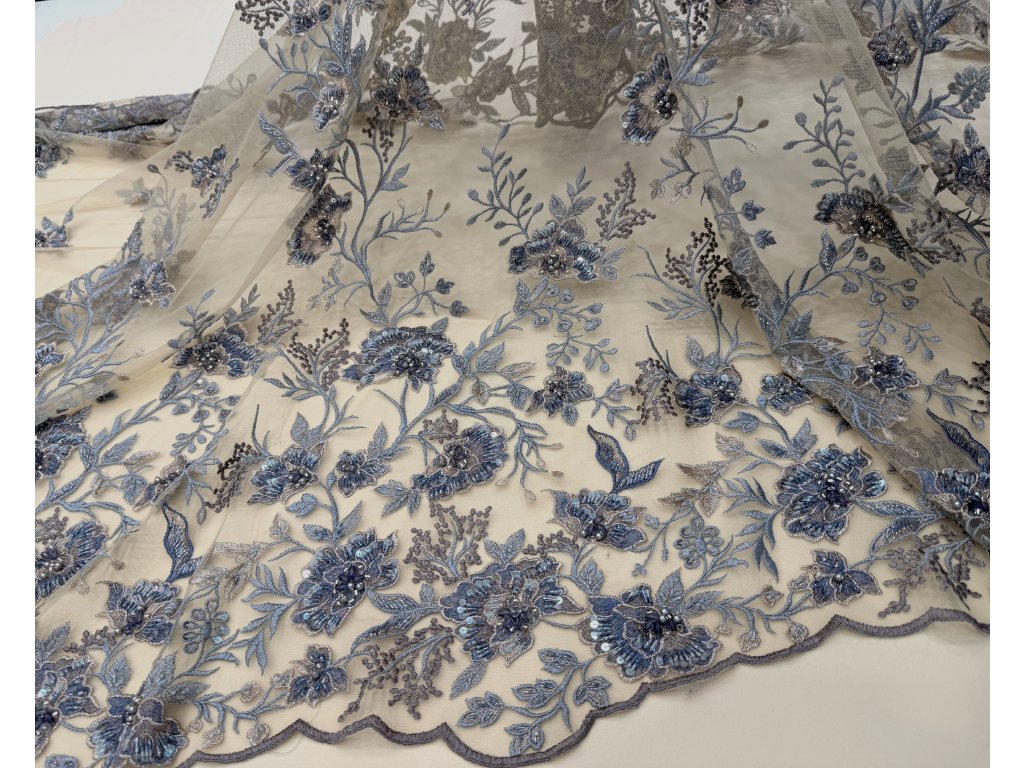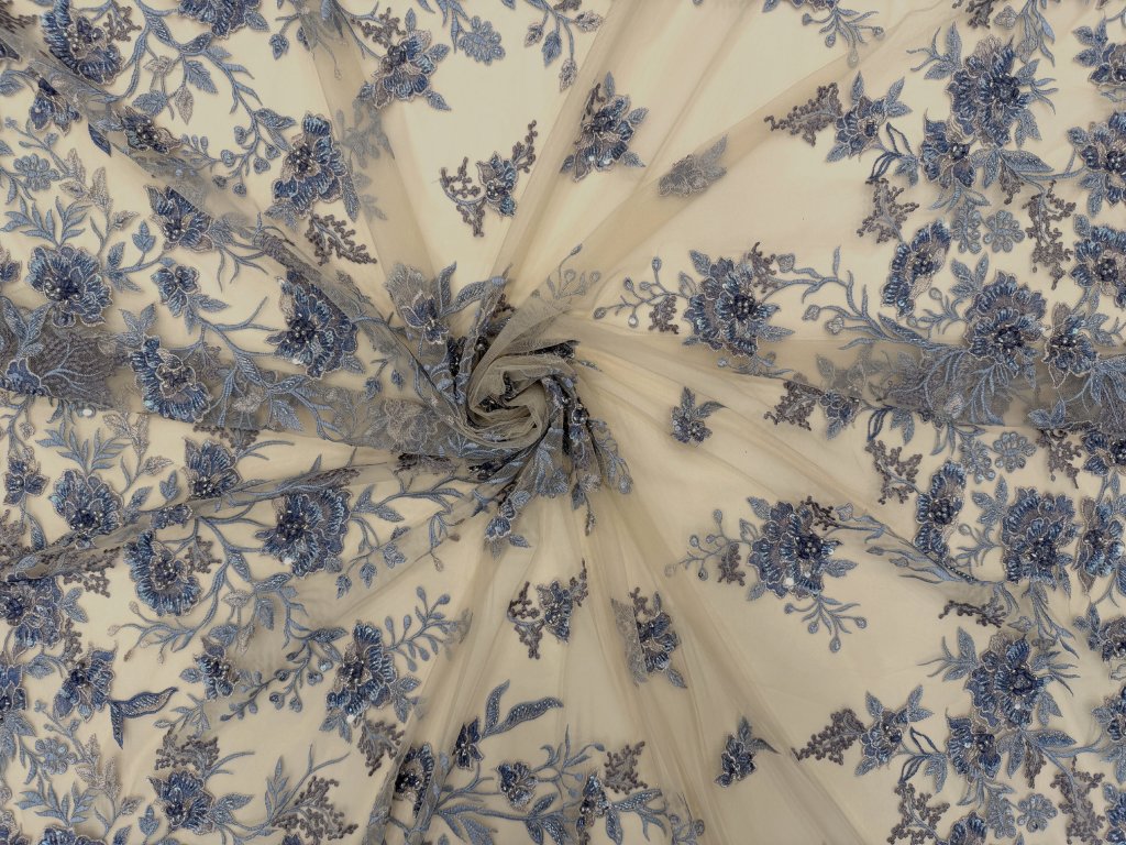 Vyšívaná krajka na jemném tylovém podkladu v odstínu cappuccino. Bohatá květinová výšivka v tónech modré, šedo-stříbrné a mocca je doplněna korálky, flitry a plastickými detaily, které vytvářejí jemný efekt hloubky a luxusního třpytu.